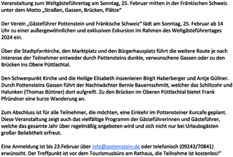 Pottenstein (Gästeführer Pottenstein und Fränkische Schweiz e.V.). Der Verein „Gästeführer Pottenstein und Fränkische Schweiz“ lädt unter dem Motto „Straßen, Gassen, Brücken, Plätze“, am Sonntag, 25. Februar 2024, ab 14 Uhr zu einer außergewöhnlichen und exklusiven Exkursion im Rahmen des Weltgästeführertages 2024 ein. Über die Stadtpfarrkirche, den Marktplatz und den Bürgerhausplatz führt die weitere Route je nach Interesse der Teilnehmer entweder durch Pottensteins dunkle, verwunschene Gassen oder zu den Brücken ins Obere Püttlachtal. Den Schwerpunkt Kirche und die Heilige Elisabeth inszenieren Birgit Haberberger und Antje Güllner. Durch Pottensteins Gassen führt der Nachtwächter Bernie Bauernschmitt, welcher das Schlitzohr und Halunken (Thomas Büttner) dort aufgreift. Zu den Brücken im Oberen Püttlachtal bietet Frank Pfründner eine kurze Wanderung an. Zum Abschluss ist für alle Teilnehmer, die möchten, eine Einkehr im Pottensteiner Kurcafe geplant. Diese Veranstaltung zeigt auch das vielfältige Programm der Gästeführerinnen und Gästeführer, welche das gesamte Jahr über regelmäßig angeboten wird und sich nicht nur bei Urlaubsgästen großer Beliebtheit erfreut. Eine Anmeldung ist bis 23.Februar über E-Mail: info@pottenstein.de oder telefonisch unter 09243/70841erwünscht. Der Treffpunkt ist vor dem Tourismusbüro am Rathaus, die Teilnahme ist kostenlos!“