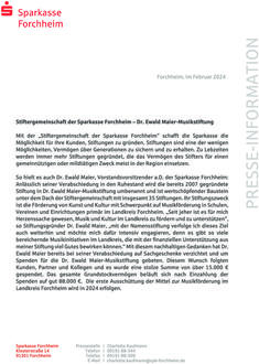 (Sparkasse Forchheim). Mit der „Stiftergemeinschaft der Sparkasse Forchheim“ schafft die Sparkasse die Möglichkeit für Ihre Kunden, Stiftungen zu gründen. Stiftungen sind eine der wenigen Möglichkeiten, Vermögen über Generationen zu sichern und zu erhalten. Zu Lebzeiten werden immer mehr Stiftungen gegründet, die das Vermögen des Stifters für einen gemeinnützigen oder mildtätigen Zweck meist in der Region einsetzen. So hielt es auch Dr. Ewald Maier, Vorstandsvorsitzender a.D. der Sparkasse Forchheim: Anlässlich seiner Verabschiedung in den Ruhestand wird die bereits 2007 gegründete Stiftung in Dr. Ewald Maier-Musikstiftung umbenannt und ist wertschöpfender Baustein unter dem Dach der Stiftergemeinschaft mit insgesamt 35 Stiftungen. Ihr Stiftungszweck ist die Förderung von Kunst und Kultur mit Schwerpunkt auf Musikförderung in Schulen, Vereinen und Einrichtungen primär im Landkreis Forchheim. „Seit jeher ist es für mich Herzenssache gewesen, Musik und Kultur im Landkreis zu fördern und zu unterstützen“, so Stiftungsgründer Dr. Ewald Maier, „mit der Namensstiftung verfolge ich dieses Ziel auch weiterhin und möchte mich dafür intensiv engagieren, denn es gibt so viele bereichernde Musikinitiativen im Landkreis, die mit der finanziellen Unterstützung aus meiner Stiftung viel Gutes bewirken können.“ Mit diesem nachhaltigen Gedanken hat Dr. Ewald Maier bereits bei seiner Verabschiedung auf Sachgeschenke verzichtet und um Spenden für die Dr. Ewald Maier-Musikstiftung gebeten. Diesem Wunsch folgten Kunden, Partner und Kollegen und es wurde eine stolze Summe von über 15.000 Euro gespendet. Das gesamte Grundstockvermögen beläuft sich nach Einzahlung der Spenden auf gut 88.000 Euro. Die erste Ausschüttung der Mittel zur Musikförderung im Landkreis Forchheim wird in 2024 erfolgen.