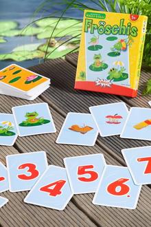 Wer zuerst alle acht Karten aufgedeckt und richtig sortiert hat, gewinnt und spielt in der nächsten Runde mit nur sieben Karten. Das geht so lange, bis ein Spielender nur noch eine Karte hat und den finalen Sieg einfährt. Fröschis ist empfohlen für zwei bis vier Kinder ab fünf Jahren.