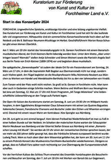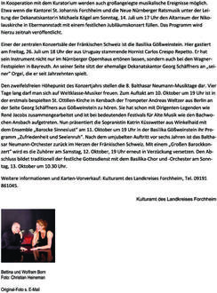 Forchheim (Kuratorium zur Förderung von Kunst und Kultur im Forchheimer Land e.V.). Das Kuratorium zur Förderung von Kunst und Kultur im Forchheimer Land hat sich für das laufende Jahr viel vorgenommen. Höhepunkte sind ein sommerliches Konzertwochenende hoch oben auf der Neideck und die 8. Balthasar Neumann-Musiktage im Herbst. Geschäftsführerin Marion Rossa-Schuster gibt einen kleinen Überblick. Am 7. März um 19 Uhr startet das Veranstaltungsjahr in St. Gereon Forchheim mit einem literarisch-musikalischen Abend, der Erich Kästners Berlin lebendig werden lässt. Unter dem Motto „Aber unter- kriegen lassen? Niemals!“ stellen Antje Schneider und Simon Weinert sowie die Pianistin Angela Stoll aus Berlin Texte von Erich Kästner (1899-1974) vor und begleiten diese musikalisch. Die spätgotische „Gereonskapelle“ ist zudem der ideale Ort für ein Passionskonzert am Sonntag, 24. März um 17 Uhr, in dem die Sopranistin Ralli Bogdan aus Ebermannstadt nicht nur singt, sondern auch Violine spielt. Am Flügel begleitet sie die Musikprofessorin Miku Nishimoto-Neubert aus München zu Werken von Händel und Mendelssohn-Bartholdy bis hin zu den vier Jahreszeiten von Vivaldi. Zum Tanzen wird der Platz wohl nicht reichen. So groß ist St. Gereon in Forchheim nicht. Man kann aber auch in Gedanken einige Schritte machen. Wenn Bettina und Wolfram Born aus Neuengönna bei Jena am Sonntag, 12. Mai um 17 Uhr mit ihrem Programm „Mi Tango Misterioso“ eine leidenschaftliche Liebeserklärung an den Tango aufs Parkett legen. Die Open Air-Saison des Kuratoriums startet am Samstag, 8. Juni um 19:30 Uhr im Wildpark Hundshaupten, in dem Eggolsheims Bürgermeister Claus Schwarzmann mit seinen Les Quatres Baguettes italienische Canzoni, französische Chansons und deutsche Lieder den Elchen und Wisenten vorsingen wird. Diesmal mit einem neuen Mann am Kontrabass: Alex Spengler aus Nürnberg. Am 28. Juni geht es erst einmal bergauf. Vom kleinen Freibad bei Niederfellendorf ist man zu Fuß in einer halben Stunde auf der Neideck. Im Schatten der malerischen Ruine warten der Schauspieler Martin Neubauer aus Bamberg und der Gitarrist Stefan Grasse aus Nürnberg mit einer „Romantischen Lesung mit Musik“. Sie werden ab 19 Uhr einen der romantischen Dichter sprechen lassen, der vor mehr als 200 Jahren dafür gesorgt hat, dass die Fränkische Schweiz europaweit berühmt wurde: Ludwig Tieck. Wem es hoch oben über dem Wiesenttal gefallen hat, der kann am 30. Juni um 11 Uhr zu einem Picknick-Konzert des Musikvereins Forchheim-Buckenhofen wiederkommen. Übrigens so gelegt, dass es Fußball-Fans später noch rechtzeitig zur Live-Übertragung der Europameisterschaft schaffen. Vor der herrlichen Kulisse des Schloss Thurn erwartet das Ensemble Hundshaupten die Besucherinnen und Besucher am Sonntag, den 7. Juli um 18 Uhr mit Werken von Barock bis zur Gegenwart. In Kooperation mit dem Kuratorium werden auch großangelegte musikalische Ereignisse möglich. Etwa wenn die Kantorei St. Johannis Forchheim und die Neue Nürnberger Ratsmusik unter der Leitung der Dekanatskantorin Michaela Kögel am Sonntag, 14. Juli um 17 Uhr den Altarraum der Niko- lauskirche in Ebermannstadt mit einem festlichen Jubiläumskonzert füllen. Das Programm wird hierzu zeitnah veröffentlicht. Einer der zentralen Konzertsäle der Fränkischen Schweiz ist die Basilika Gößweinstein. Hier gastiert am Freitag, 26. Juli um 18 Uhr der aus Uruguay stammende Hornist Carlos Crespo Repetto. Er hat sein Instrument nicht nur im Nürnberger Opernhaus ertönen lassen, sondern auch bei den Wagner-Festspielen in Bayreuth. An seiner Seite sitzt der ehemalige Dekanatskantor Georg Schäffners an „sei- ner“ Orgel, die er seit Jahrzehnten spielt. Den zweifelsfreien Höhepunkt des Konzertjahrs stellen die 8. Balthasar Neumann-Musiktage dar. Vier Tage lang darf man sich auf Weltklasse-Musiker freuen. Zum Auftakt am 10. Oktober um 19 Uhr ist in der erstmals bespielten St. Ottilien-Kirche in Kersbach der Trompeter Andreas Weltzer aus Berlin an der Seite Georg Schäffners aus Gößweinstein zu hören. Sie hat schon mit Dirigenten-Legenden wie René Jacobs zusammengearbeitet und ist bei bedeutenden Festivals für Alte Musik wie den Bachwochen Ansbach aufgetreten. Nun präsentiert die Sopranistin Katrin Küsswetter aus Winkelhaid mit dem Ensemble „Barocke Sinneslust“ am 11. Oktober um 19 Uhr in der Basilika Gößweinstein ihr Programm „Zufriedenheit und Seelenruh“. Nach dem umjubelten Auftritt vor sechs Jahren ist das Balthasar Neumann-Orchester zurück im Herzen der Fränkischen Schweiz. Mit einem „Großen Barockkonzert“ wird es die Zuhörer am Samstag, 12. Oktober, 19 Uhr erneut in Verzückung versetzen. Den Abschluss bildet traditionell der festliche Gottesdienst mit dem Basilika-Chor und -Orchester am Sonntag, 13. Oktober um 10.30 Uhr. Weitere Informationen und Karten-Vorverkauf: Kulturamt des Landkreises Forchheim, Tel. 09191/861045.