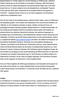 Heute führt der „Jüdische Pfad“ zwei Geschichten in der Stadt Forchheim zusammen, erklärt der Historiker Rolf Kießling, Autor der Broschüre „Stolpersteine in Forchheim“ zur Eröffnungsfeier: 14 „Stolpersteine“ zur Erinnerung an die Ermordung der jüdischen Mitbürger*innen gibt es heute. Getragen von einem breiten bürgerschaftlichen Engagement initiierte Emmerich Huber maßgeblich mit Kießling die Stolpersteinverlegungen - 2018 die erste mit dem Künstler Gunter Demnig. „Viele Menschen halten diese Form der Erinnerung für sinnvoll und notwendig“, so Kießling, „jeder Stolperstein steht für einen konkreten Menschen, für ein ganzes Leben, das willentlich ausgelöscht worden ist!“ Zu dieser wichtigen Erinnerungskultur kommt der „Jüdische Pfad“ als weiterer Baustein hinzu. Er führt analog und digital überwiegend durch die Altstadt Forchheims an ehemalige jüdische Wohnorte und erzählt umfassend recherchierte Geschichte und Geschichten.