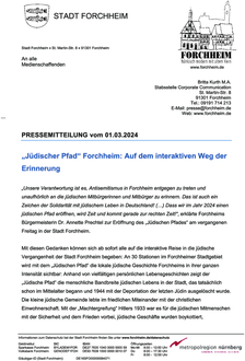(Stadt Forchheim). „Unsere Verantwortung ist es, Antisemitismus in Forchheim entgegen zu treten und unaufhörlich an die jüdischen Mitbürgerinnen und Mitbürger zu erinnern. Das ist auch ein Zeichen der Solidarität mit jüdischem Leben in Deutschland! (…) Dass wir im Jahr 2024 einen jüdischen Pfad eröffnen, wird Zeit und kommt gerade zur rechten Zeit!“, erklärte Forchheims Bürgermeisterin Dr. Annette Prechtel zur Eröffnung des „Jüdischen Pfades“ in der Stadt Forchheim. Mit diesen Gedanken können sich ab sofort alle auf die interaktive Reise in die jüdische Vergangenheit der Stadt Forchheim begeben: An 30 Stationen im Forchheimer Stadtgebiet wird mit dem „Jüdischen Pfad“ die lokale jüdische Geschichte Forchheims in ihrer ganzen Intensität sichtbar: Anhand von vielfältigen persönlichen Lebensgeschichten zeigt der „Jüdische Pfad“ die menschliche Bandbreite jüdischen Lebens in der Stadt, das tatsächlich schon im Mittelalter begann und 1944 mit der Deportation der letzten Jüdin ausgelöscht wurde. Die kleine jüdische Gemeinde lebte im friedlichen Miteinander mit der christlichen Einwohnerschaft. Mit der „Machtergreifung“ Hitlers 1933 war es für die jüdischen Mitmenschen mit der Sicherheit und dem Frieden vorbei, jüdische Geschäfte wurden boykottiert, Unternehmen arisiert, Menschen jüdischen Glaubens waren Schikanen und Verfolgungen ausgesetzt. In der Reichspogromnacht 1938 wurde die Forchheimer Synagoge geschändet und zerstört, jüdische Mitbürger*innen misshandelt. Wer nicht rechtzeitig noch ins rettende Ausland flüchten konnte, wurde ab 1941 deportiert und in den Konzentrationslagern ermordet - dies traf 14 jüdische Personen in Forchheim.