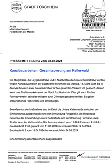 (Stadt Forchheim). Die Ringstraße, die Leygeberstraße und in Abschnitten die Untere Kellerstraße werden wegen Kanalbauarbeiten der Stadtwerke Forchheimbis in den Mai hinein in zwei Bauabschnitten für den gesamten Verkehr voll gesperrt, darauf weist das Straßenverkehrsamt der Stadt Forchheim hin. Dies gilt auch für den Fahrradverkehr, teilweise müssen auch Gehwege gesperrt werden. Es gelten entsprechende Haltverbote und Umleitungen. Betroffen von der Maßnahme sind im Detail die Untere Kellerstraße zwischen der Einmündung Leygeberstraße und der Einmündung Ringstraße, die Ringstraße zwischen der Einmündung Untere Kellerstraße und der Kreuzung Hermann-Löns- Straße bzw. der Lichteneiche. Die Sperrung dauert bis zum 24. Mai 2024: Bauabschnitt 1: ist geplant bis voraussichtlich 12. April 2024, Bauabschnitt 2 vom 15. April 2024 bis voraussichtlich 24. Mai 2024. Eine Umleitung ist entsprechend ausgeschildert.