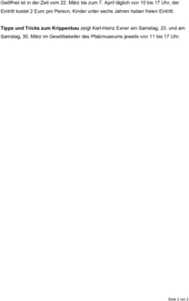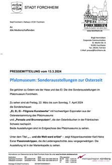 (Stadt Forchheim). Sie gehören zu Ostern wie der Hase und das Ei: Die drei Sonderausstellungen im Pfalzmuseum Forchheim. Zu sehen sind ab Freitag, 22. März bis zum Sonntag, 7. April 2024 die Sonderschauen „Ei, Ei, Ei - Filigrane Kunstwerke“ mit hochwertigen Exponaten aus der Ostereiersammlung des Pfalzmuseums und „Pensala und Brunnenputzen“, die den Osterbräuchen in der Fränkischen Schweiz nachspürt. Beide Ausstellungen sind im Erdgeschoss des Pfalzmuseums zu sehen. Unter dem Titel „… und die Welt ward erlöst“ - zeigt Krippenbaumeister Karl-Heinz Exner Passionskrippen, die die Leidensgeschichte Jesu vergegenwärtigen. Die Ausstellung ist in der Marienkapelle zu sehen. Geöffnet ist in der Zeit vom 22. März bis zum 7. April täglich von 10 bis 17 Uhr, der Eintritt kostet 2 Euro pro Person, Kinder unter sechs Jahren haben freien Eintritt. Tipps und Tricks zum Krippenbau zeigt Karl-Heinz Exner am Samstag, 23. und am Samstag, 30. März im Gewölbekeller des Pfalzmuseums jeweils von 11 bis 17 Uhr.