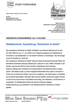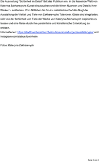 (Stadt Forchheim). Die Ausstellung "Schönheit im Detail" mit Bildern von Katerina Zakharevych ist noch bis zum 11. Juni 2024 in der Treppenhausgalerie der Stadtbücherei Forchheim in der Spitalstraße 3 in der Stadt Forchheim zu besichtigen. Die Ausstellung zeigt eine Sammlung beeindruckender Bilder der talentierten Künstlerin. Geboren im Jahr 1988 in Rowenki in der Ukraine, lebt sie seit 2022 mit ihrer Familie in Weilersbach bei Forchheim. Kateryna Zakharevych entdeckte ihre Leidenschaft für die Malerei bereits in jungen Jahren. Das Malen wurde zu einem integralen Bestandteil ihres Lebens: Sie sieht ihr Talent als „ein Geschenk Gottes“, das es ihr ermögliche, ihre Erfahrungen und Gefühle auf Leinwand festzuhalten. Mit jedem Bild, das sie schaffe, wachse ihre eigene Freude an der Kunst und sie finde in der Malerei einen Weg, ihre Gedanken und Emotionen zu verarbeiten. Ihr Selbststudium führte sie auf einen Weg der stetigen Weiterentwicklung, der schließlich in der Meisterschaft der "Schönheit im Detail" gipfelte. Die Ausstellung "Schönheit im Detail" lädt das Publikum ein, in die fesselnde Welt von Katerina Zakharevychs Kunst einzutauchen und die feinen Nuancen und Details ihrer Werke zu entdecken. Vom Stillleben bis hin zu realistischen Porträts fängt die Ausstellung die Vielfalt und Tiefe von Zakharevychs Talent ein. Gäste sind eingeladen, sich von der Schönheit und Tiefe der Werke von Kateryna Zakharevych inspirieren zu lassen und eine Reise durch ihre persönliche und künstlerische Entwicklung zu erleben. Informationen: www.stadtbuecherei.forchheim.de/veranstaltungen/ausstellungen/ und instagram.com/stabue.forchheim.