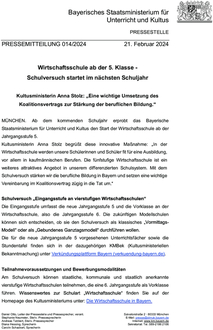 München (StUmK Bayern). Ab dem kommenden Schuljahr erprobt das Bayerische Staatsministerium für Unterricht und Kultus den Start der Wirtschaftsschule ab der Jahrgangsstufe 5. Kultusministerin Anna Stolz begrüßt diese innovative Maßnahme: „In der Wirtschaftsschule werden unsere Schülerinnen und Schüler fit für eine Ausbildung, vor allem in kaufmännischen Berufen. Die fünfstufige Wirtschaftsschule ist ein weiteres attraktives Angebot in unserem differenzierten Schulsystem. Mit dem Schulversuch stärken wir die berufliche Bildung in Bayern und setzen eine wichtige Vereinbarung im Koalitionsvertrag zügig in die Tat um.“ Schulversuch „Eingangsstufe an vierstufigen Wirtschaftsschulen“ Die Eingangsstufe umfasst die neue Jahrgangsstufe 5 und die Vorklasse an der Wirtschaftsschule, also die Jahrgangsstufe 6. Die zukünftigen Modellschulen können sich entscheiden, ob sie den Schulversuch als klassisches „Vormittags- Modell“ oder als „Gebundenes Ganztagsmodell“ durchführen wollen. Die für die neue Jahrgangsstufe 5 vorgesehenen Unterrichtsfächer sowie die Stundentafel finden sich in der dazugehörigen KMBek (Kultusministeriellen Bekanntmachung) unter Verkündungsplattform Bayern (verkuendung-bayern.de). Teilnahmevoraussetzungen und Bewerbungsmodalitäten Am Schulversuch können staatliche, kommunale und staatlich anerkannte vierstufige Wirtschaftsschulen teilnehmen, die eine 6. Jahrgangsstufe als Vorklasse führen. Wissenswertes zur Schulart „Wirtschaftsschule“ finden Sie auf der Homepage des Kultusministeriums unter www.km.byern.de.