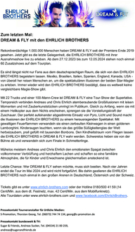 Nürnberg (E. Kretz). Rekordverdächtige 1.000.000 Menschen haben DREAM & FLY seit der Premiere Ende 2019 gesehen. Jetzt gibt es die letzte Gelegenheit, die EHRLICH BROTHERS mit ihrer Ausnahmeshow live zu erleben. Immer wieder wird den EHRLICH BROTHERS bestätigt, dass es weltweit keine vergleichbare Magie-Show gibt. Mit 22 Trucks und einer 100-Mann-Crew ist DREAM & FLY eine Tour-Show der Superlative. Temporeich verbinden Andreas und Chris Ehrlich atemberaubende Großillusionen mit leisen Momenten und mit Zauberkunststücken umringt im Publikum. Gleich zu Anfang, wenn sie mit einem Helikopter aus dem Nichts erscheinen, sprengen sie die Vorstellungskraft der Zuschauer. Der perfekt aufeinander abgestimmte Einsatz von Pyro, Licht und Sound macht die Illusionen der EHRLICH BROTHERS zu einem herausragenden Spektakel. Mit gewaltigen Feuerflammen verwandeln sie einen zerbeulten Kleinwagen in einen goldenen Lamborghini. Kinderaugen leuchten, wenn sie das größte Süßigkeitenglas der Welt herbeizaubern, prall gefüllt mit tausenden Bonbons. Mühelos meistern Andreas und Chris Ehrlich den emotionalen Spagat zwischen vollkommener Verblüffung und herzhaftem Lachen und schaffen so eine familiäre Atmosphäre, die für Kinder und Erwachsene gleichermaßen ansteckend ist. Letzte Chance: Wer DREAM & FLY sehen möchte, muss sich beeilen. Nach vier Jahren endet die Tour im Mai 2024 und wird nicht fortgeführt. Zugast in der Arena Nürnberger Versicherung sind sie am Samstag 4. Mai 2024 um 14 Uhr + 19 Uhr sowie am Sonntag, 5. Mai 2024, um 11 Uhr + 16 Uhr. Tickets gibt es unter www.ehrlich-brothers.com oder der Hotline 0180/500 41 59 (14 Cent/Min. aus dem dt. Festnetz, max. 42 Cent/Min. aus dem Mobilfunknetz).