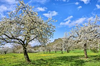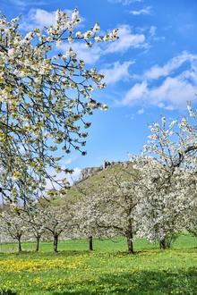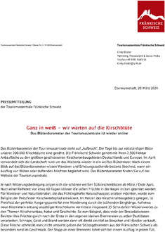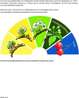 (Tourismuszentrale Fränkische Schweiz). Das Blütenbarometer der Tourismuszentrale steht auf „Aufbruch“. Die Tage bis zur vollständigen Blüte unserer 200.000 Kirschbäume sind gezählt. Die Fränkische Schweiz gehört mit ihren 2.500 Hektar Anbaufläche zu den größten geschlossenen Kirschenanbaugebieten Deutschlands und Europas. Im April verwandelt sich die Landschaft rund um das Walberla wieder in ein weißes Blütenmeer. Nach einem Blick auf das Blütenbarometer wissen Wanderer und Erholungssuchende bestens Bescheid, wann ein Ausflug von Blüten oder duftenden Früchten begleitet wird. Das Blütenbarometer finden Sie auf der Website der Tourismuszentrale. Je nach Witterungsbedingung zeigen sich die schönen weißen Süßkirschenblüten ab Mitte / Ende April. Nach einer Reifezeit von etwa 60 Tagen können die süßen Früchte in der Regel im Juni geerntet werden. Für Wanderer und Naturliebhaber, die das frühlingshafte Naturschauspiel erleben möchten, wurde zum Beispiel der Pretzfelder Kirschenlehrpfad entwickelt. Im Herzen des Kirschenanbaugebiets gelegen, ist Pretzfeld der perfekte Ausgangspunkt für eine Wanderung durch die blühenden Berghänge. Auf etwa neun Kilometern entlang unzähliger Kirschbäume vermitteln insgesamt 15 Schautafeln Wissenswertes zu den Themen Kirschenanbau, Natur und Geschichte. So zum Beispiel, dass viele der Streuobstwiesen-Besitzer ihre Früchte gleich nach der Ernte in den eigenen kleinen Brennereien zu edlen Destillaten verarbeiten. Schnaps, Geist und Brand werden dann oft direkt am Hof an Besucher und Händler verkauft. Diese Frische schmeckt man; nicht umsonst gelten die Selbstgebrannten aus der Fränkischen Schweiz als besonders rund im Geschmack. Der Stopp an einer Brennerei lohnt sich bei einem Ausflug in jedem Fall. Auch die Genussbotschafter der Fränkischen Schweiz bieten Führungen durch die Obstgärten an. Tief in der Region verwurzelt, teilen sie ihr Wissen gerne mit den Gästen und begleiten sie auf ihrem Ausflug durch die blühende Landschaft. Weiterführende Informationen zur Obstblüte und zur Kirschregion gibt es unter: www.fraenkische-schweiz.com/erleben/sehenswert/kirschbluete.