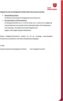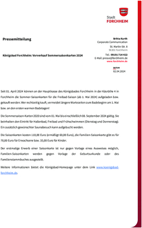 (Stadt Forchheim). Seit 1. April 2024 können an der Hauptkasse des Königsbades Forchheim in der Käsröthe 4 in Forchheim die Sommer-Saisonkarten für die Freibad-Saison (ab 1. Mai 2024) aufgeladen bzw. gekauft werden. Wer rechtzeitig kauft, vermeidet längere Wartezeiten zum Badebeginn am 1. Mai bzw. an den ersten warmen Badetagen! Die Sommersaison-Karten 2024 sind vom 01. Mai bis einschließlich 08. September 2024 gültig. Sie beinhalten den Eintritt für Hallenbad, Freibad und Frühschwimmen (Dienstag und Donnerstag). Ein zusätzlich gewünschter Saunabesuch kann aufgebucht werden. Die Saisonkarten kosten 110,00 Euro (ermäßigt 60,00 Euro), die Familien-Saisonkarte gibt es für 70,00 Euro für Erwachsene bzw. 35,00 Euro für Kinder. Der erstmalige Erwerb einer Saisonkarte ist nur gegen Vorlage eines Ausweises möglich, Familien-Saisonkarten werden gegen Vorlage der Geburtsurkunde oder des Familienstammbuches ausgestellt. Folgende Termine des Königsbads Forchheim bitte schon einmal vormerken: