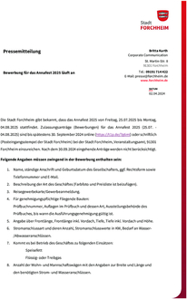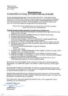 (Stadt Forchheim). Die Stadt Forchheim gibt bekannt, dass das Annafest 2025 von Freitag, 25. Juli 2025 bis Montag, 4. August 2025 stattfindet. Zulassungsanträge (Bewerbungen) für das Annafest 2025 (25.07. - 04.08.2025) sind bis spätestens 30. September 2024 online (https://t1p.de/7g6ml) oder schriftlich (Posteingangsstempel der Stadt Forchheim) bei der Stadt Forchheim, Veranstaltungsamt, 91301 Forchheim einzureichen. Nach dem 30.09.2024 eingehende Anträge werden nicht berücksichtigt. Folgende Angaben müssen zwingend in der Bewerbung enthalten sein:
