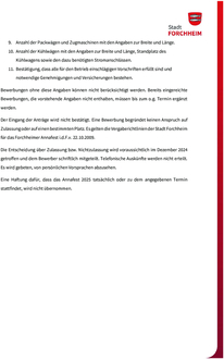 Bewerbungen ohne diese Angaben können nicht berücksichtigt werden. Bereits eingereichte Bewerbungen, die vorstehende Angaben nicht enthalten, müssen bis zum o.g. Termin ergänzt werden. Der Eingang der Anträge wird nicht bestätigt. Eine Bewerbung begründet keinen Anspruch auf Zulassung oder auf einen bestimmten Platz. Es gelten die Vergaberichtlinien der Stadt Forchheim für das Forchheimer Annafest i.d.F.v. 22.10.2009. Die Entscheidung über Zulassung bzw. Nichtzulassung wird voraussichtlich im Dezember 2024 getroffen und dem Bewerber schriftlich mitgeteilt. Telefonische Auskünfte werden nicht erteilt. Es wird gebeten, von persönlichen Vorsprachen abzusehen. Eine Haftung dafür, dass das Annafest 2025 tatsächlich oder zu dem angegebenen Termin stattfindet, wird nicht übernommen.