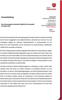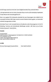 (Stadt Forchheim). Sie ist da! Susanne Winter ist die neue Citymanagerin der Stadt Forchheim und bereits seit Anfang April im Dienst. Eingegliedert in das städtische Referat 3 „Wirtschaft und Tourismus“ ist es die vordringliche Aufgabe der erfahrenen Marketing-Expertin in Zusammenarbeit mit den Akteur*innen des Einzelhandels und der Gastronomie ein praxisorientiertes, realitätsnahes Leitbild für die Innenstadt zu entwickeln. Die 1976 in Erlangen geborene Diplom-Geographin betont dabei ihren starken Bezug zur Region: Im Landkreis Erlangen-Höchstadt aufgewachsen zog es sie natürlich auch immer wieder nach Forchheim, ob zum Freunde treffen, zum Feiern auf die Schleuseninsel, zum Einkaufen oder auf das Annafest. Ihr Studium der Diplom-Geographie mit Schwerpunkt Physische Geographie an der FAU-Erlangen Nürnberg schloss Winter im Jahr 2002 ab. Es folgte ein Promotionsstudium an der Humboldt Universität Berlin von 2003 bis 2005. Seit 2005 war Winter im Bereich Projektmanagement im Marketing, vor allem in Berlin, tätig: „Während dieser Zeit konnte ich reichlich Erfahrung in verschiedenen Bereichen, wie dem Durchführen von Messen, Online-Marketingkampagnen und Content-Marketing gewinnen. Nach längerer Zeit bin ich aus Berlin wieder zurückgekehrt in die Region. Während meiner Zeit in Berlin habe ich viel Wissen erworben, welches als Transferwissen in den kommenden Projekten zur Weiterentwicklung der Innenstadt sehr nützlich sein wird. Während meiner Weiterbildung 2023 zum Scrum Master habe ich zudem ein agiles Rahmenwerk kennengelernt, mit dem sich auch komplexe Sachverhalte im Team effektiv lösen lassen. Dies wird im Citymanagement mit seinen stark verflochtenen Aufgabenbereichen hilfreich sein!“ Auf die Frage, worauf sie sich bei der neuen Aufgabe besonders freut, antwortet Winter: „Mir liegt Netzwerken sehr am Herzen. Besonders freue ich mich auf die individuelle Projektarbeit mit den Akteuren der Innenstadt jeglicher Art!“ Was ist nun geplant? Bis Jahresende entwickelt die neue Citymanagerin das Leitbild für die Innenstadt Forchheim 2030. Dabei möchte sie akute Probleme direkt angehen, um konstruktiv zeitnahe Lösungsansätze zu finden. Alle Akteur*innen in der Innenstadt können sich jederzeit an das Citymanagement im Amt für Marketing, Tourismus und Internationale Beziehungen wenden. „Wir freuen uns auf einen direkten Austausch!“, betont Winter. Kontakt: Susanne Winter Stadt Forchheim • Citymanagement • St.-Martin-Str. 8 • 91301 Forchheim Tel: +49 (0)9191 714-127 E-Mail: citymanagement@forchheim.de Web: www.forchheim-erleben.de.