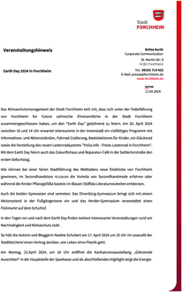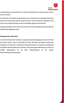 (Stadt Forchheim). Das Klimaschutzmanagement der Stadt Forchheim teilt mit, dass sich unter der Federführung von Forchheim for Future zahlreiche Ehrenamtliche in der Stadt Forchheim zusammengeschlossen haben, um den “Earth Day” gebührend zu feiern. Am 20. April 2024 zwischen 10 und 14 Uhr erwartet Interessierte in der Innenstadt ein vielfältiges Programm mit Informations- und Aktionsständen, Fahrrad-Codierung, Bastelaktionen für Kinder, ein Glücksrad sowie die Vorstellung des neuen Lastenradsystems "freila.info - Freies Lastenrad in Forchheim". Mit dem Earth Day feiern auch das Zukunftshaus und Reparatur-Café in der Sattlertorstraße den ersten Geburtstag. Alle können bei einer fairen Stadtführung des Weltladens neue Eindrücke von Forchheim gewinnen, im Secondhandstore ni.cocon die Vorteile von Secondhandmode erfahren oder während die Kinder Pflanzgefäße basteln im Blauen Stäffala Literaturneuheiten entdecken. Auch die beiden Gymnasien sind vertreten: Das Ehrenbürg-Gymnasium bringt sich mit einem Aktionsstand in der Fußgängerzone ein und das Herder-Gymnasium veranstaltet einen Flohmarkt auf dem Schulhof. In den Tagen nach dem Earth Day finden weitere interessante Veranstaltungen rund um Nachhaltigkeit und Klimaschutz statt. Am Montag, 22.April 2024, um 18 Uhr eröffnet die Karikaturenausstellung „Glänzende Aussichten“ in der Hauptstelle der Sparkasse und als abschließendes Highlight zeigt die Energie- und-Klima-Allianz am 26. April 2024 um 17:45 Uhr den aktuellen Film „Plastic Fantastic“ im Kino- Center Forchheim. Der “Earth Day” in Forchheim verspricht also nicht nur informative und unterhaltsame Aktionen, sondern auch jede Menge Spaß für die ganze Familie. Die ehrenamtlichen Organisator*innen freuen sich auf zahlreiche Gäste und einen nachhaltigen Tag für unseren Planeten. Das gesamte Programm kann unter www.forchheim-for-future/earthday abgerufen werden.