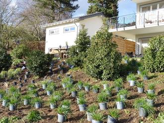 Wurden bis vor ein paar Jahren noch Kies- und Schotteraufschüttungen als vermeintlich pflegeleicht propagiert, so weiß man dies heute besser. Diese toten Flächen verursachen nach ein paar Jahren richtig viel Arbeit, weil sie nur sehr schwer von Unkräutern freigehalten werden können. Heute wünscht man sich ums Haus dagegen lebendige Flächen, die ohne großen Aufwand Regenwasser speichern, zur Kühlung beitragen und dem Haus ein freundliches Erscheinungsbild geben. Im Gegensatz zu harten Steinbelägen sorgen Gräser für Charme und Dynamik in den verschiedenen Lagen. Für schattigere Stellen eignen sich verschiedene Carex Sorten (Seggen), aber auch Hakonechloa (Japanwaldgras), Briza media (Zittergras) oder Luzula (Hainsimse). In der Sonne machen sich gern Festuca (Schwingel), Pennisetum (Federborstengras) und Sesleria (Kopfgras) breit. Letztere gehört übrigens zu den besonders frühen Gräsern. Auch die Blüten, die wie winzige Ähren aussehen, sind reizvoll. Manchmal sehen sie fast lavendelfarben aus.