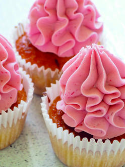 7. Fertige Creme in einen Spritzbeutel geben und die abgekühlten Cupcakes damit verzieren. Zuletzt noch die Erdbeeren auf die Creme geben.