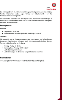 Die Sommer-Saisonkarten für die Freibad-Saison können an der Hauptkasse des Königsbades aufgeladen bzw. gekauft werden. Sie sind bis einschließlich 8. September 2024 gültig und beinhalten den Eintritt für Hallenbad, Freibad und Frühschwimmen (Dienstag und Donnerstag). Ein zusätzlich gewünschter Saunabesuch kann aufgebucht werden. Der erstmalige Erwerb einer Saisonkarte ist nur gegen Vorlage eines Ausweises möglich, Familien-Saisonkarten werden gegen Vorlage der Geburtsurkunde oder des Familienstammbuches ausgestellt. Die Saisonkarten kosten 110 Euro (ermäßigt 60 Euro), die Familien-Saisonkarte gibt es für 70 Euro für Erwachsene bzw. für 35 Euro für Kinder (Informationen: www.koenigsbad- forchheim.de/Eintrittspreise).