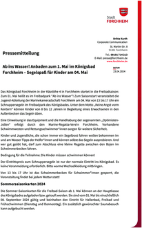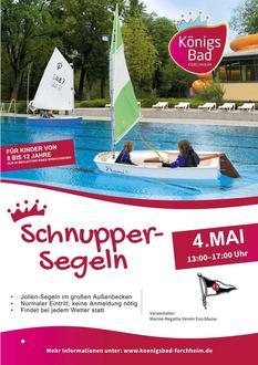 (Stadt Forchheim). Das Königsbad Forchheim in der Käsröthe 4 in Forchheim ist am 1. Mai in die Freibadsaison gestartet. Zum Saisonstart veranstaltet die Jugend-Abteilung der Marinekameradschaft Forchheim am 4. Mai von 13 bis 17 Uhr ein Schnuppersegeln im Freibadpark des Königsbades. Unter dem Motto „Keine Angst vorm Kentern“ können Kinder von 8 bis 12 Jahren in Begleitung eines Erwachsenen in den Außenbecken das Segeln üben. Eine Einweisung in das Equipment und die Handhabung der sogenannten „Optimisten-Jollen“ erfolgt durch den Marine-Regatta-Verein Forchheim. Vorhandene Schwimmwesten und Rettungsschwimmer*innen sorgen für weitere Sicherheit. Kinder und Jugendliche, die schon immer ein Segelboot fahren wollen bekommen im und am Wasser Tipps der Helfer*innen und können selbst das Segeln ausprobieren. Und wer gut geübt hat, darf zum Abschluss eine kleine Regatta zwischen den Bojen im Schwimmerbecken fahren. Bedingung für die Teilnahme: Die Kinder müssen schwimmen können! Der Eintrittspreis zum Schnuppersegeln ist nur der normale Eintritt ins Königsbad. Es keine Voranmeldung erforderlich. Bitte warme Wechselkleidung mitbringen. Von 13 bis 17 Uhr ist das Schwimmerbecken für Schwimmer*innen gesperrt, die Veranstaltung findet bei jedem Wetter statt!