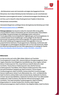 (V. li.): Björn Weber, Referent und Teamleiter Forschungsbereich Umwelt, Difu), Johannes Widmann (Energiemanagement, Simon Hegele), Maximilian Streit (Mitglied der Geschäftsführung, Simon Hegele), Gerhard Meixner (Fraktionssprecher FGL), Sonja Kohlmann-Huberth (Kämmerin, Stadt Forchheim), Thomas Werner (Fraktionssprecher CSU), Manfred Hümmer (Fraktionssprecher Freie Wähler), Reiner Büttner (Fraktionssprecher SPD), Corinna Stirnweiß (Amtsleiterin Stadtplanung, Stadt Forchheim), Thomas Seybert (Facilitymanagement, Stadt Forchheim), Andreas Gottschlich (Locationmanager, Siemens Healthineers), Herbert Fuchs (Referatsleiter Bau-, Grün- und Bäderbetrieb, Stadt Forchheim), Andreas Müller (Leiter Zentrale Dienste, Stadtwerke Forchheim), Christian Sponsel (Geschäftsführer, Stadtwerke Forchheim), Renè Franz (Referatsleiter Stadtbauamt, Stadt Forchheim), Elisa Rittmeier (Klimaschutzmanagerin, Stadt Forchheim), Timo Sokol (Amtsleiter Facilitymanagement, Stadt Forchheim), Bürgermeisterin Dr. Annette Prechtel (FGL), Christine Liebert-Dippold (Klimaschutzmanagement, Stadt Forchheim).