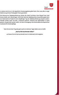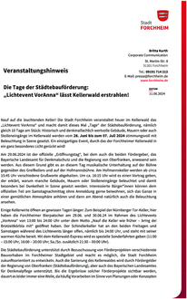 (Stadt Forchheim). Nauf auf die leuchtenden Keller! Die Stadt Forchheim veranstaltet heuer im Kellerwald das „Lichtevent VorAnna“ und macht damit dieses Mal „Tage“ der Städtebauförderung, nämlich gleich zehn Tage am Stück: Historisch und denkmalfachlich wertvolle Gebäude, Mauern oder auch Stolleneingänge im Kellerwald werden vom 28. Juni bis zum 7. Juli 2024 stimmungsvoll mit Beleuchtung in Szene gesetzt. Ein einzigartiges Event, durch das der Forchheimer Kellerwald in ein ganz besonderes Licht gerückt wird! Am 29.Juni 2024 ist der offizielle „Eröffnungstag“, bei dem auch die beiden Fördergeber, das Bayerische Landesamt für Denkmalschutz und die Regierung von Oberfranken, anwesend sein werden. Aus diesem Grund gibt es an diesem Tag musikalische Unterhaltung auf der Bühne gegenüber des Greifkellers und auf der Hofmannsbühne. Am Hofmannskeller werden ab circa 15.45 Uhr verschiedene Grußworte abgehalten. Um ca. 16.15 Uhr wird es einen Vortrag geben, der erklärt, warum manche Gebäude, Mauern oder Stolleneingänge beleuchtet und damit besonders bei Dunkelheit in Szene gesetzt werden. Interessierte Bürger*innen können dem offiziellen Teil am Samstagnachmittag ohne Anmeldung gerne beiwohnen, sich das Ganze in einer gemütlichen Atmosphäre anhören und dann am Abend natürlich auch die Beleuchtung ansehen. Einige Kellerwirte öffnen an gewissen Tagen länger: Zum Beispiel der Nürnberger Tor-Keller, hier haben die Forchheimer Bierpatscher am 29. und 30. Juni im Rahmen des Lichtevents „VorAnna“ von 13 bis 24 Uhr unter dem Motto „Nauf die Keller wie früher - bring dei Brotzeitkörbla mit“ geöffnet haben. Der Schindlerkeller hat an den beiden Freitagen und Samstagen während des Lichtevents länger offen, nämlich bis 24 Uhr, und steht mit seiner warmen Küche bereit. Mit dem Kellerwald-Express wird es spezielle Sonderfahrten geben (11 Uhr - 15 Uhr, 16 - 20 Uhr; Sa./So. zusätzlich 21.30 - 00 Uhr). Die Städtebauförderung unterstützt durch Bezuschussung von Förderprojekten verschiedenste Bauvorhaben im Forchheimer Stadtgebiet und macht es möglich, die Stadt Forchheim zukunftsorientiert zu entwickeln. Auch die Sanierung des Kellerwaldes wird durch Fördergelder der Regierung von Oberfranken (Städtebauförderung), aber auch des Bayerischen Landesamtes für Denkmalpflege unterstützt. Bis die Ergebnisse solcher Förderprojekte sichtbar werden, dauert es leider immer eine Weile, da häufig Vorarbeiten im Sinne von Planungen oder Konzepten zu leisten sind, bis es in die eigentliche Umsetzungsphase gehen kann. Dies muss alles in enger Abstimmung mit den Fördergeber*innen geschehen. Die Wirkung der Städtebauförderung möchte die Stadt Forchheim ihren Bürger*innen aber bereits dieses Jahr näherbringen. Durch den Start des städtebaulichen Gesamtkonzeptes kann der Kellerwald als Projekt für den diesjährigen Tag der Städtebauförderung bespielt werden: Deshalb werden heuer mit dem „Lichtevent VorAnna“, Bereiche des Kellerwaldes in Szene gesetzt, die geschützt werden sollen, z.B. durch Eintragung in die Denkmalliste des Bayerischen Landesamt für Denkmalpflege. Seien Sie an einem Tag oder gerne auch an mehreren Tagen dabei, wenn es heißt: „Nauf auf die leuchtenden Keller!“ und lassen Sie sich das leuchtende Event im Kellerwald nicht entgehen.