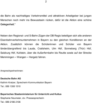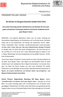 München (Bayerisches Staatsministerium für Unterricht und Kultus). Auf kostenlos Bahnfahren dürfen sich am ersten Ferientag der Sommerferien wieder Bayerns 1er-Schülerinnen und 1er-Schüler freuen. Die Aktion richtet sich an die Schülerinnen und Schüler der bayerischen Grund-, Mittel-, Förder-, Wirtschafts-, Real-, Fachober- und Berufsoberschulen sowie Gymnasien mit einer „Eins“, einem „Sehr gut“ oder einer entsprechenden aktuellen Punktzahl im Zeugnis oder mit einem sehr guten Verbalgutachten. Die freie Fahrt gilt am 29. Juli 2024 von 0 Uhr bis 24 Uhr in allen Nahverkehrszügen in Bayern in der 2. Klasse. Mitzubringen sind eine Zeugniskopie und ein gültiger Personal-, Kinder- oder Schülerausweis. „Eure Einser haben sich gelohnt: Ihr könnt damit nun einen Tag lang kostenlos mit der Bahn durch Bayern reisen. Zum Beginn der Sommerferien könnt Ihr damit vielleicht auch noch unbekannte Orte in Bayern kennenlernen. Ich wünsche Euch ganz viel Spaß bei Eurem Ausflug und viele neue Eindrücke! Ein großes Dankeschön an die DB Regio und die anderen Eisenbahnverkehrsunternehmen in Bayern, die unseren Schülerinnen und Schülern diesen Tag ermöglichen“, sagt Bayerns Kultusministerin Anna Stolz. Patrick Pönisch, Regionalleiter Marketing DB Regio Bayern, betont: „Umweltfreundlich und bequem durch ganz Bayern reisen - das geht nur mit der Bahn. Am ersten Ferientag haben alle 1er-Schülerinnen und 1er-Schüler einen ganztägigen Freifahrtschein. Wir hoffen, dass viele Kinder und Jugendliche das tolle Angebot nutzen und zum Ferienstart fleißig mit dem Zug unterwegs sind. Wir wollen die Bahn als nachhaltiges Verkehrsmittel und attraktiven Arbeitgeber bei jungen Menschen noch mehr ins Bewusstsein rücken, dafür ist die Aktion eine schöne Gelegenheit.“