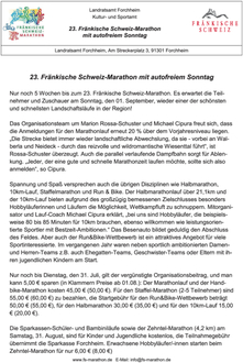 (Landratsamt Forchheim Kultur- und Sportamt). Nur wenige Wochen bis zum 23. Fränkische Schweiz-Marathon. Es erwartet die Teilnehmer und Zuschauer am Sonntag, 1. September, wieder einer der schönsten und schnellsten Landschaftsläufe in der Region! Das Organisationsteam um Marion Rossa-Schuster und Michael Cipura freut sich, dass die Anmeldungen für den Marathonlauf erneut 20 % über dem Vorjahresniveau liegen. „Die Strecke bietet immer wieder landschaftliche Abwechslung, da sie - vorbei an Walberla und Neideck - durch das reizvolle und wildromantische Wiesenttal führt“, ist Rossa-Schuster überzeugt. Auch die parallel verlaufende Dampfbahn sorgt für Ablenkung. „Jeder, der eine gute und schnelle Marathonzeit laufen möchte, sollte sich also anmelden“, so Cipura. Spannung und Spaß versprechen auch die übrigen Disziplinen wie Halbmarathon, 10 km-Lauf, Staffelmarathon und Run & Bike. Der Halbmarathonlauf über 21,1 km und der 10 km-Lauf bieten aufgrund des großzügig bemessenen Zielschlusses besonders Hobbyläuferinnen und Läufern die Möglichkeit, Wettkampfluft zu schnuppern. Mitorganisator und Lauf-Coach Michael Cipura erklärt, „bei uns sind Hobbyläufer, die beispielsweise 80 bis 85 Minuten für 10 km brauchen, ebenso willkommen wie leistungsorientierte Sportler mit Bestzeit-Ambitionen.“ Das Besenauto bildet geduldig den Abschluss des Feldes. Aber auch der Run&Bike-Wettbewerb ist ein attraktives Angebot für viele Sportinteressierte. Im vergangenen Jahr waren neben sportlich ambitionierten Damen- und Herren-Teams z.B. auch Ehegatten-Teams, Geschwister-Teams oder Eltern mit ihren jugendlichen Kindern am Start. Nur noch bis Dienstag, 31. 07., gilt der vergünstigte Organisationsbeitrag, und man kann 5,00 € sparen (in Klammern Preise ab 01.08.): Der Marathonlauf und der Hand- bike-Marathon kosten 45,00 € (50,00 €). Für den Staffel-Marathon (2-5 Teilnehmer) sind 55,00 € (60,00 €) zu bezahlen, die Startgebühr für den Run&Bike-Wettbewerb beträgt 50,00 € (55,00 €), für den Halbmarathon 30,00 € (35,00 €) und für den 10km-Lauf 15,00 € (20,00 €). Die Sparkassen-Schüler- und Bambiniläufe sowie der Zehntel-Marathon (4,2 km) am Samstag, 31. August, sind für Kinder und Jugendliche kostenlos, die Teilnahmegebühr übernimmt die Sparkasse Forchheim. Erwachsene Hobbyläufer/-innen starten beim Zehntel-Marathon für nur 6,00 € (8,00 €).