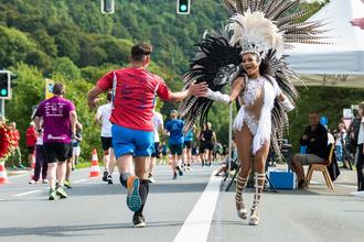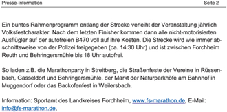 Ein buntes Rahmenprogramm entlang der Strecke verleiht der Veranstaltung jährlich Volksfestcharakter. Nach dem letzten Finisher kommen dann alle nicht-motorisierten Ausflügler auf der autofreien B470 voll auf ihre Kosten. Die Strecke wird wie immer abschnittsweise von der Polizei freigegeben (ca. 14.30 Uhr) und ist zwischen Forchheim Reuth und Behringersmühle bis 18 Uhr autofrei. So laden z.B. die Marathonparty in Streitberg, die Straßenfeste der Vereine in Rüssenbach, Gasseldorf und Behringersmühle, der Markt der Naturparkhöfe am Bahnhof in Muggendorf oder das Backofenfest in Weilersbach.Alle wichtigen Informationen sowie Anmeldung unter www.fs-marathon.de.