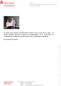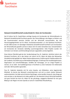 (Sparkasse Forchheim). Seit 22 Jahren hat Dr. Ewald Maier wichtige Impulse als Vorsitzender der Wirtschaftsseite im Netzwerk SchuleWirtschaft Forchheim gesetzt. Das Thema Bildung in der Region zu fördern und die Zusammenarbeit zwischen Schulen und der Wirtschaft voranzutreiben, das sind Herzensangelegenheiten von Dr. Maier, Vorstandsvorsitzender a. D. der Sparkasse Forchheim. Im Jahr 2002 wurde er im damaligen Arbeitskreis SchuleWirtschaft Forchheim zum Vorsitzenden der Wirtschaftsseite gewählt und hat in dieser Zeit mit vielen Schulräten bzw. Schulamtsleitern als Vorsitzende der Schulseite tatkräftig zusammengearbeitet. Viele Projekte wurden mit Vertretern von Schulen und Wirtschaft gemeinsam angestoßen und durchgeführt. Einen kleinen Überblick gab bei der Verabschiedung Frau Dr. Haderlein, fachliche Leiterin des Schulamt Forchheim, die in den letzten vier Jahren mit Dr. Maier die Spitze des Netzwerkes SchuleWirtschaft gebildet hat: Neben Podiumsdiskussionen, Einführung der Praktikumsbörse für den Landkreis, Durchführung von Betriebsbesichtigungen, Erstellung eines Ausbildungskompass, Organisation von Lehrerfortbildungen, Schaffen der Homepage, um nur einige Projekte zu nennen, ist vor allem die Ausbildungsmesse in Forchheim zu einer Institution mit mittlerweile weit über 100 Ausstellern geworden. Frau Dr. Haderlein bedankte sich für seine Impulse, sein Mitdenken, seine begeisternde Mitarbeit. So konnte das Netzwerk vorwärtskommen und sich zu einem starken Netzwerk weiterentwickeln. Sie lobte seine kritischen Nachfragen, seinen großen Anspruch, dass Dinge gut sind und dass er das Netzwerk mit Leben gefüllt hat. Das Netzwerk Schule Wirtschaft bedankte sich ganz herzlich bei Herrn Dr. Maier für die jahrelange, engagierte Mitarbeit für eine gute Bildung in der Region mit einer Spende an seine Dr. Ewald Maier-Musikstiftung.Dr.