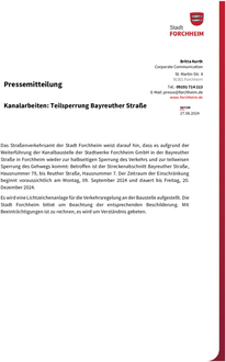 (Stadt Forchheim). Das Straßenverkehrsamt der Stadt Forchheim weist darauf hin, dass es aufgrund der Weiterführung der Kanalbaustelle der Stadtwerke Forchheim GmbH in der Bayreuther Straße in Forchheim wieder zur halbseitigen Sperrung des Verkehrs und zur teilweisen Sperrung des Gehwegs kommt: Betroffen ist der Streckenabschnitt Reuther Straße, Hausnummer 77 bis Hausnummer 63. Der Zeitraum der Einschränkung beginnt voraussichtlich am Montag, 09. September 2024 und dauert bis Freitag, 20. Dezember 2024. Es wird eine Lichtzeichenanlage für die Verkehrsregelung an der Baustelle aufgestellt. Die Stadt Forchheim bittet um Beachtung der entsprechenden Beschilderung. Mit Beeinträchtigungen ist zu rechnen, es wird um Verständnis gebeten.