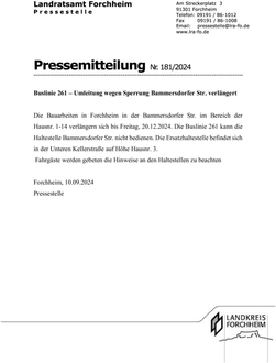 (LRA FO). Die Bauarbeiten in Forchheim in der Bammersdorfer Str. im Bereich der Hausnr. 1-14 verlängern sich bis Freitag, 20. Dezember 2024. Die Buslinie 261 kann die Haltestelle Bammersdorfer Str. nicht bedienen. Die Ersatzhaltestelle befindet sich in der Unteren Kellerstraße auf Höhe Hausnr. 3. Fahrgäste werden gebeten die Hinweise an den Haltestellen zu beachten