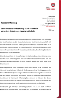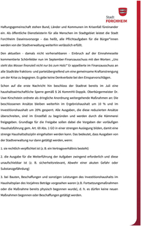 (Stadt Forchheim). Eine drastische Gewerbesteuerrückerstattung in Höhe von ca. 55,8 Mio. Euro kommt auf die Stadt Forchheim zu. Die Haushaltssituation der Stadt Forchheim verschärft sich dadurch erheblich: Einnahmen und Ausgaben entwickeln sich wesentlich anders als in der Planung angenommen und der Haushaltsausgleich ist im Jahr 2024 voraussichtlich nicht mehr zu erreichen. Vielmehr muss sichergestellt werden, dass die Ausgabemittel im Haushaltsjahr ausreichen werden. Schon Ende Juni hatte ein Steuerpflichtiger der Stadt eine Steuerrückerstattung von ca. 19,5 Mio. Euro bekanntgegeben. Die nun vorherrschende Differenz setzt sich aus mehreren Beträgen zusammen, die nicht mitgeteilt wurden und somit bisher nicht bekannt waren. Finanzbürgermeister Udo Schönfelder hatte Ende Februar 2024 zusammen mit Kämmerin Sonja Kohlmann-Huberth für die Beratungen mit auf den Weg gegeben, den Fokus auf die Pflichtaufgaben zu legen und in anderen Bereichen möglichst zu kürzen um die Verschuldung möglichst in vertretbaren Grenzen zu halten und die notwendigen Investitionen für kommunale Pflichtaufgaben stemmen zu können. Der daraus resultierende Haushalt, der aktuell erst im September von der Aufsichtsbehörde des Landratsamtes genehmigt wurde, wurde immerhin einstimmig verabschiedet. Grundsätzlich gilt: Öffentliche Gebietskörperschaften wie z.B. die Stadt Forchheim können nicht insolvent gehen, das ist gesetzlich nicht möglich. Als gesamtstaatliche Haftungsgemeinschaft stehen Bund, Länder und Kommunen im Krisenfall füreinander ein. Als öffentliche Dienstleisterin für alle Menschen im Stadtgebiet leistet die Stadt Forchheim Daseinsvorsorge - das heißt, alle Pflichtaufgaben für die Bürger*innen werden von der Stadtverwaltung weiterhin verlässlich erfüllt. Den aktuellen - damals nicht vorhersehbaren - Einbruch auf der Einnahmeseite kommentierte Schönfelder nun im September-Finanzausschuss mit den Worten: „Uns steht das Wasser finanziell nicht nur bis zum Hals!“ Er appellierte im Finanzausschuss an alle Stadträte fraktions- und parteiübergreifend um eine gemeinsame Kraftanstrengung um der Krise zu begegnen. Es gebe keine Denkverbote bei den Einsparvorschlägen. Schon auf die erste Nachricht hin beschloss der Stadtrat bereits im Juli eine haushaltswirtschaftliche Sperre gemäß § 26 KommHV-Doppik. Oberbürgermeister Dr. Uwe Kirschstein ordnete als dringliche Anordnung weitergehende Maßnahmen an: Die beschlossenen Ansätze bleiben weiterhin im Ergebnishaushalt um 10 % und im Investitionshaushalt um 20% gesperrt. Alle Ausgaben, die diese reduzierten Ansätze überschreiten, sind im Einzelfall zu begründen und werden durch die Kämmerei freigegeben. Grundlage für die Freigabe sollen dabei die Vorgaben der vorläufigen Haushalsführung gem. Art. 69 Abs. 1 GO in einer strengen Auslegung bilden, damit eine strenge Haushaltsdisziplin eingehalten werden kann. Das bedeutet, dass Ausgaben von der Stadtverwaltung nur dann getätigt werden, wenn: