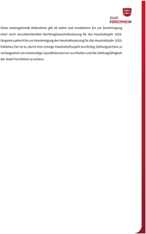 Diese weitergehende Maßnahme gilt ab sofort und mindestens bis zur Genehmigung einer noch vorzubereitenden Nachtragshaushaltssatzung für das Haushaltsjahr 2024, längstens jedoch bis zur Genehmigung der Haushaltssatzung für das Haushaltsjahr 2025. Erklärtes Ziel ist es, durch eine strenge Haushaltsdisziplin kurzfristig Zahlungsströme zu verlangsamen um notwendige Liquiditätsreserven zu erhalten und die Zahlungsfähigkeit der Stadt Forchheim zu sichern.
