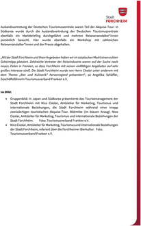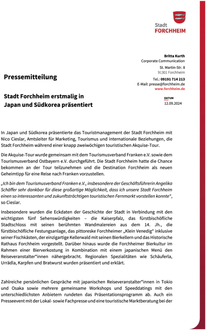 (Stadt Forchheim). In Japan und Südkorea präsentierte das Touristmanagement der Stadt Forchheim mit Nico Cieslar, Amtsleiter für Marketing, Tourismus und internationale Beziehungen, die Stadt Forchheim während einer knapp zweiwöchigen touristischen Akquise-Tour. Die Akquise-Tour wurde gemeinsam mit dem Tourismusverband Franken e.V. sowie dem Tourismusverband Ostbayern e.V. durchgeführt. Die Stadt Forchheim hatte die Chance bekommen an der Tour teilzunehmen und die Destination Forchheim als neuen Geheimtipp für eine Reise nach Franken vorzustellen. „Ich bin dem Tourismusverband Franken e.V., insbesondere der Geschäftsführerin Angelika Schäffer sehr dankbar für diese großartige Möglichkeit, dass ich unsere Stadt Forchheim einen so interessanten und zukunftsträchtigen touristischen Fernmarkt vorstellen konnte“, so Cieslar. Insbesondere wurden die Eckdaten der Geschichte der Stadt in Verbindung mit den wichtigsten fünf Sehenswürdigkeiten - die Kaiserpfalz, das fürstbischöfliche Stadtschloss mit seinen berühmten Wandmalereien aus dem 14. Jh., die fürstbischöfliche Festungsanlage, das pittoreske Forchheimer „Klein Venedig“ inklusive seiner Fischkästen, der einzigartige Kellerwald mit seinen Bierkellern und das Historische Rathaus Forchheim vorgestellt. Darüber hinaus wurde die Forchheimer Bierkultur im Rahmen einer Bierverkostung in Kombination mit einem japanischen Menü den Reiseveranstalter*innen nähergebracht. Regionalen Spezialitäten wie Schäuferla, Urrädla, Karpfen und Bratwurst wurden präsentiert und erklärt. Zahlreiche persönlichen Gespräche mit japanischen Reiseveranstalter*innen in Tokio und Osaka sowie mehrere gemeinsame Workshops und Speeddatings mit den unterschiedlichsten Anbietern rundeten das Präsentationsprogramm ab. Auch ein Presseevent mit der Lokal- sowie Fachpresse und eine touristische Marktberatung bei der Auslandsvertretung der Deutschen Tourismuszentrale waren Teil der Akquise-Tour. In Südkorea wurde durch die Auslandsvertretung der Deutschen Tourismuszentrale ebenfalls ein Marktbriefing durchgeführt und mehrere Reiseveranstalter*innen persönlich besucht. Hier wurde ebenfalls ein Workshop mit zahlreichen Reiseveranstalter*innen und der Presse abgehalten. „Mit der Stadt Forchheim und ihren Angeboten haben wir im asiatischen Markt einen echten Geheimtipp platziert. Zahlreiche Vertreter der Reiseindustrie waren auf der Suche nach neuen Zielen in Franken, so dass Forchheim mit seinen vielfältigen Angeboten auf sehr großes Interesse stieß. Die Stadt Forchheim wurde von Herrn Cieslar unter anderem mit dem Thema „Bier und Kulinarik“ hervorragend präsentiert“, so Angelika Schäffer, Geschäftsführerin Tourismusverband Franken e.V.