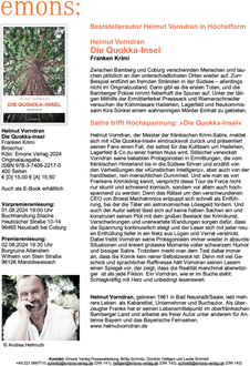 (Emons Verlag). Zwischen Bamberg und Coburg verschwinden Menschen und tauchen plötzlich an den unterschiedlichsten Orten wieder auf. Zum Beispiel entführt an fremden Stränden in der Südsee - allerdings nicht im Originalzustand. Dann gibt es die ersten Toten, und die Bamberger Polizei nimmt fieberhaft die Spuren auf. Unter der tätigen Mithilfe der Ermittlerferkel Presssack und Riemenschneider versuchen die Kommissare Haderlein, Lagerfeld und Neukommissarin Kira Sünkel einem wahnsinnigen Mörder Einhalt zu gebieten. Helmut Vorndran, der Meister der fränkischen Krimi-Satire, meldet sich mit „Die Quokka-Insel“ eindrucksvoll zurück und präsentiert seinen Fans einen Fall, der selbst für das Kultteam um Haderlein, Lagerfeld & Co zu einer harten Nuss wird. Stilsicher verwickelt Vorndran seine beliebten Protagonisten in Ermittlungen, die vom fränkischen Hinterland bis in die Südsee führen und erzählt von den Verheißungen der „Künstlichen Intelligenz“, aber auch von der handfesten, rein menschlichen Dummheit. Und wie man es von Frankens Krimikönig kennt, verspricht diese Tour de Force nicht nur skurril und schreiend komisch, sondern vor allem auch hoch- spannend zu werden: Denn das Rätsel um den verschwundenen CEO von Brosst Mechatronics entpuppt sich schnell als Entführung, bei der die Täter ein astronomisches Lösegeld fordern. Und auch der Autor selbst lässt sich auf keine halben Sachen ein und konstruiert seinen Plot mit dem großen Besteck der Krimikunst. Verschwörungen und unerwartete Wendungen sorgen dafür, dass die Spannung kontinuierlich steigt und der Leser sich mit jeder neuen Enthüllung tiefer in ein Netz aus Lügen und Verrat verstrickt. Dabei treibt Vorndran seine Protagonisten immer wieder in absurde Situationen und kreiert groteske Momente voller schwarzem Humor und bissiger Satire. Trotzdem merkt man dem Text dabei immer an, dass die Komik kein reiner Selbstzweck ist: Denn mit viel Geschick und sprachlicher Raffinesse hält Vorndran seinen Lesern einen Spiegel vor, der zeigt, dass die Realität manchmal aberwitziger ist als jede Fiktion. Ein Vorndran, wie er im Buche steht: Schlagkräftig mit Herz und unbedingt lesenswert. Köln: Emons Verlag 2024, Originalausgabe, ISBN 978-3-7408-2217-0, 400 Seiten, € [D] 15,00 € [A] 15,50. Auch als E-Book erhältlich.