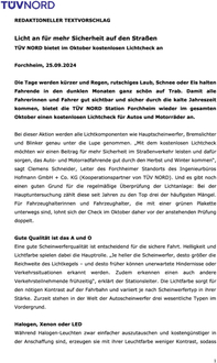 Bei dieser Aktion werden alle Lichtkomponenten wie Hauptscheinwerfer, Bremslichter und Blinker genau unter die Lupe genommen. „Mit dem kostenlosen Lichtcheck möchten wir einen Beitrag für mehr Sicherheit im Straßenverkehr leisten und dafür sorgen, das Auto- und Motorradfahrende gut durch den Herbst und Winter kommen“, sagt Clemens Schneider, Leiter des Forchheimer Standorts des Ingenieurbüros Hofmann GmbH + Co. KG (Kooperationspartner von TÜV NORD). Und es gibt noch einen guten Grund für die regelmäßige Überprüfung der Lichtanlage: Bei der Hauptuntersuchung zählt diese seit Jahren zu den Top drei der häufigsten Mängel. Für Fahrzeughalterinnen und Fahrzeughalter, die mit einer grünen Plakette unterwegs sind, lohnt sich der Check im Oktober daher vor der anstehenden Prüfung doppelt.