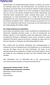 Damit andere nicht geblendet werden, müssen Leuchtweite und Lichteinstellung der Scheinwerfer regelmäßig kontrolliert werden, vor allem bei Veränderungen der Beladung. Während zu hoch eingestellte Leuchten den Gegenverkehr blenden und vorausfahrende Fahrzeuge im Rückspiegel irritieren können, schränken zu niedrig eingestellte Scheinwerfer aufgrund des kleineren Lichtkegels die eigene Sicht ein. Dies kann besonders zur Hochsaison des Wildwechsels gefährlich werden. Beim Lichttest steht die technische Überprüfung aller Leuchtkomponenten im Vordergrund, doch die Prüfingenieurinnen und Prüfingenieure vor Ort beantworten auch gern alle Fragen rund um das Thema Scheinwerfer. „Wir freuen uns auf zahlreiche Besucherinnen und Besucher im Oktober und die Aktion allgemein, die auf den Straßen für mehr Sichtbarkeit und damit auch mehr Sicherheit sorgt“, sagt Schneider.