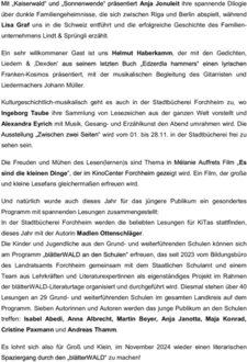 Es lohnt sich also für Groß und Klein, im November 2024 wieder einen literarischen Spaziergang durch den „blätterWALD“ zu machen!