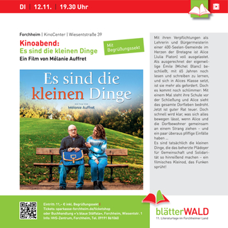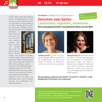 Kulturgeschichtlich-musikalisch geht es auch in der Stadtbücherei Forchheim zu, wo Ingeborg Taube ihre Sammlung von Lesezeichen aus der ganzen Welt vorstellt und Alexandra Eyrich mit Musik, Gesang- und Erzählkunst den Abend umrahmen wird. Die Ausstellung „Zwischen zwei Seiten“ wird vom 01. bis 28.11. in der Stadtbücherei frei zu sehen sein. Die Freuden und Mühen des Lesen(lernen)s sind Thema in Mélanie Auffrets Film „Es sind die kleinen Dinge“, der im KinoCenter Forchheim gezeigt wird. Ein Film, der große und kleine Lesefans gleichermaßen erfreuen wird.