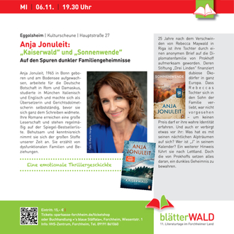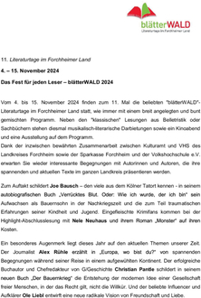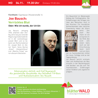 (VHS des Landkreises Forchheim). Vom 4. bis 15. November 2024 finden zum 11. Mal die beliebten "blätterWALD"- Literaturtage im Forchheimer Land statt, wie immer mit einem breit angelegten und bunt gemischten Programm. Neben den "klassischen" Lesungen aus Belletristik oder Sachbüchern stehen diesmal musikalisch-literarische Darbietungen sowie ein Kinoabend und eine Ausstellung auf dem Programm. Dank der inzwischen bewährten Zusammenarbeit zwischen Kulturamt und VHS des Landkreises Forchheim sowie der Sparkasse Forchheim und der Volkshochschule e.V. erwarten Sie wieder interessante Begegnungen mit Autorinnen und Autoren, die ihre spannenden und aktuellen Texte im ganzen Landkreis präsentieren werden. Zum Auftakt schildert Joe Bausch - den viele aus dem Kölner Tatort kennen - in seinem autobiografischen Buch „Verrücktes Blut. Oder: Wie ich wurde, der ich bin“ sein Aufwachsen als Bauernsohn in der Nachkriegszeit und die zum Teil traumatischen Erfahrungen seiner Kindheit und Jugend. Eingefleischte Krimifans kommen bei der Highlight-Abschlusslesung mit Nele Neuhaus und ihrem Roman „Monster“ auf ihren Kosten.