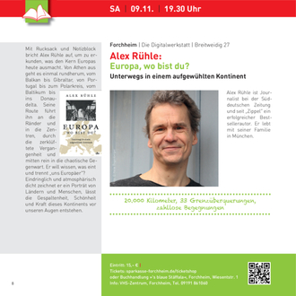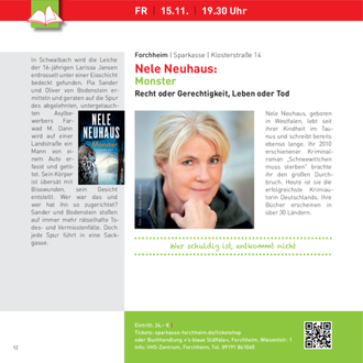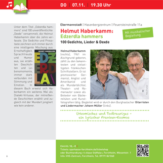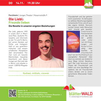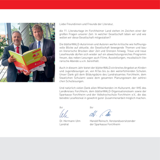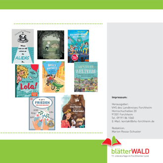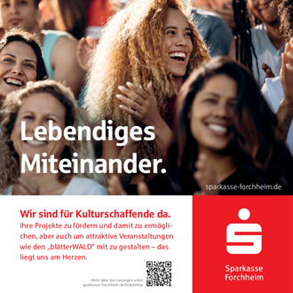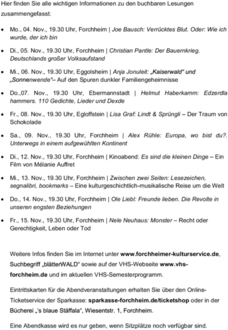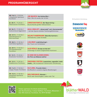 Weitere Infos finden Sie im Internet unter www.forchheimer-kulturservice.de, Suchbegriff „blätterWALD“ sowie auf der VHS-Webseite www.vhs- forchheim.de und im aktuellen VHS-Semesterprogramm. Eintrittskarten für die Abendveranstaltungen erhalten Sie über den Online- Ticketservice der Sparkasse: sparkasse-forchheim.de/ticketshop oder in der Bücherei „‘s blaue Stäffala“, Wiesentstr. 1, Forchheim. Eine Abendkasse wird es nur geben, wenn Sitzplätze noch verfügbar sind.