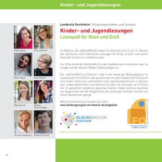 Und natürlich wurde auch dieses Jahr für das jüngere Publikum ein gesondertes Programm mit spannenden Lesungen zusammengestellt: In der Stadtbücherei Forchheim werden die beliebten Lesungen für KiTas stattfinden, dieses Jahr mit der Autorin Madlen Ottenschläger. Die Kinder und Jugendliche aus den Grund- und weiterführenden Schulen können sich am Programm „blätterWALD an den Schulen“ erfreuen, das seit 2023 vom Bildungsbüro des Landratsamts Forchheim gemeinsam mit dem Staatlichen Schulamt und einem Team aus Lehrkräften und Literaturexpertinnen als eigenständiges Projekt im Rahmen der blätterWALD-Literaturtage organisiert und durchgeführt wird. Diesmal stehen über 40 Lesungen an 29 Grund- und weiterführenden Schulen im gesamten Landkreis auf dem Programm. Sieben Autorinnen und Autoren werden das junge Publikum an den Schulen treffen: Isabel Abedi, Anna Albrecht, Martin Beyer, Anja Janotta, Maja Konrad, Cristine Paxmann und Andreas Thamm.