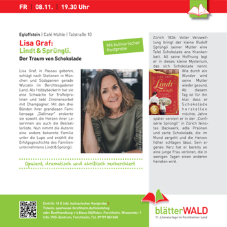 Mit „Kaiserwald“ und „Sonnenwende“ präsentiert Anja Jonuleit ihre spannende Dilogie über dunkle Familiengeheimnisse, die sich zwischen Riga und Berlin abspielt, während Lisa Graf uns in die Schweiz entführt und die erfolgreiche Geschichte des Familien- unternehmens Lindt & Sprüngli erzählt. Ein sehr willkommener Gast ist uns Helmut Haberkamm, der mit den Gedichten, Liedern & ‚Dexden‘ aus seinem letzten Buch „Edzerdla hammers“ einen lyrischen Franken-Kosmos präsentiert, mit der musikalischen Begleitung des Gitarristen und Liedermachers Johann Müller.