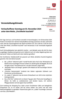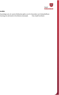 (Stadt Forchheim). Die Tage sind kurz und Forchheim erstrahlt im Novemberglanz. Am 3.November.2024 findet in Forchheim der nächste Verkaufsoffene Sonntag zusammen mit dem Jahrmarkt statt, teilt das Citymanagement der Stadt Forchheim mit. Von 12.00 bis 17.00 Uhr kann unter dem Motto „Forchheim kuschelt“ nach Herzenslust in der Innenstadt eingekauft werden. Auch Schmuddelwetter kann glücklich machen - zum Beispiel, wenn die Zeit für einen ausgiebigen Stadtbummel genutzt wird: Vielleicht noch mit netter Begleitung lässt sich das bunte Treiben am Markt und in den Lädchen genießen! Die Forchheimer Händlerschaft hat passend zum Motto attraktive Kuschel-Angebote geschürt. Hier eine kleine Auswahl: