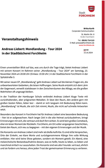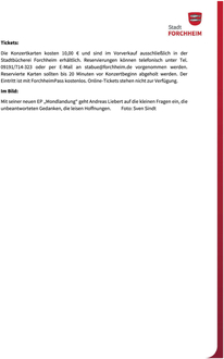 Besonders das Konzert in Forchheim hat für Andreas Liebert eine besondere Bedeutung - hier ist er aufgewachsen. Nach langer Zeit in die alte Heimat zurückzukehren, bringt Erinnerungen mit sich, die vertraut und doch fern wirken. Es wird kein großes Comeback, eher ein leiser Moment der Rückkehr. Forchheim, ein Ort voller vergangener Geschichten, bietet den Raum, sich neu zu begegnen - mit den eigenen Erinnerungen und der Musik. Die Konzerte von Andreas Liebert sind mehr als bloße Auftritte. Es sind stille Versprechen, Orte der Einkehr, wo klare Worte und zurückgenommene Klänge ihre volle Wirkung entfalten. Hier wird keine Show geboten, sondern ein Moment geteilt. Ein Abend, eine melancholische Bestandsaufnahme dessen, was es heißt, heute zu leben, zu lieben und manchmal einfach nur auszuhalten. Die Konzerte sind wie alte Freunde: vertraut, ehrlich und sie fordern uns heraus, ohne jeden Trost der gemeinsamen Erinnerung zu verlieren. Tickets: Die Konzertkarten kosten 10,00 € und sind im Vorverkauf ausschließlich in der Stadtbücherei Forchheim erhältlich. Reservierungen können telefonisch unter Tel. 09191/714-323 oder per E-Mail an stabue@forchheim.de vorgenommen werden. Reservierte Karten sollten bis 20 Minuten vor Konzertbeginn abgeholt werden. Der Eintritt ist mit ForchheimPass kostenlos. Online-Tickets stehen nicht zur Verfügung.