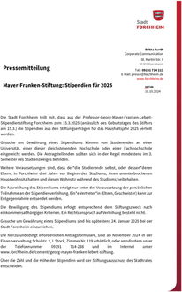 (Stadt Forchheim). Die Stadt Forchheim teilt mit, dass aus der Professor-Georg-Mayer-Franken-Lebert- Stipendienstiftung Forchheim zum 15.3.2025 (anlässlich des Geburtstages des Stifters am 15.3.) die Stipendien aus den Stiftungserträgen für das Haushaltsjahr 2025 verteilt werden. Gesuche um Gewährung eines Stipendiums können von Studierenden an einer Universität, einer dieser gleichstehenden Hochschule oder einer Fachhochschule eingereicht werden. Die Antragstellenden sollten sich in der Regel mindestens im 3. Semester des Studienzweiges befinden. Weitere Voraussetzungen sind, dass der*die Studierende selbst, oder dessen*deren Eltern, in Forchheim drei Jahre vor Beginn des Studiums, ihren ununterbrochenen Hauptwohnsitz hatten und diesen Wohnsitz während des Studiums beibehalten.