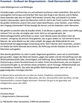 In diesem Sinne wünsche ich uns allen ein frohes, friedliches und besinnliches Weihnachtsfest. Ich danke allen Menschen, die sich, ehrenamtlich oder beruflich, um die Gemeinschaft in unserer Region kümmern. Kommen Sie gut in ein gesundes und erfolgreiches neues Jahr 2025.