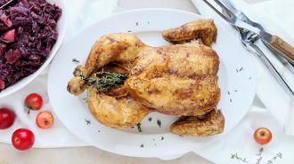 Zutaten (für 4 Personen): 1 Hähnchen, 2 TL Lebkuchengewürz, 1 TL Zimt, 1/2 TL Muskat, 2 TL brauner Zucker, 4 EL Öl, 1 Orange, Salz und Pfeffer, 300 ml Geflügelbrühe, 100 g Speckwürfel, 2 Gläser Rotkohl, 1 Apfel, 100 ml dunkler Traubensaft, Thymian.