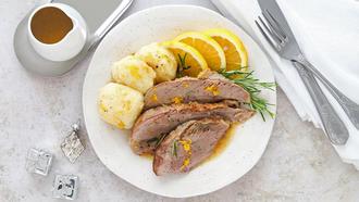 Zutaten (für 4 Personen): 2 Putenunterkeulen, 2 EL Öl, 1 Zwiebel, 1 Paket Suppengemüse, 200 ml Cointreau, 3 Orangen, 400 ml Gemüsebrühe, Rosmarin, 8 Knödel (Kühlung), 2 EL Orangenmarmelade, 2 EL Butter, Salz und Pfeffer.