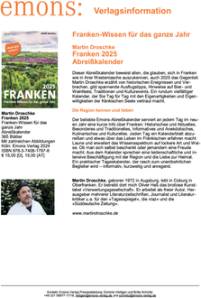 Emons Verlag. Dieser Abreißkalender beweist allen, die glauben, sich in Franken wie in ihrer Westentasche auszukennen, auch 2025 das Gegenteil. Martin Droschke erzählt von historischen Ereignissen und Ver- brechen, gibt spannende Ausflugstipps, Hinweise auf Bier- und Weinfeste, Traditionen und Kulturevents. Ein rundum vielfältiger Kalender, der Sie Tag für Tag mit den Eigenartigkeiten und Eigen- willigkeiten der fränkischen Seele vertraut macht.