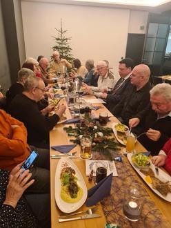 Hausen (D. Gonschorowski). Am 14.12.2024 fand die Weihnachtsfeier des Skatclubs „Die Forellen Forchheim“ im „Pilatushof“ in Hausen statt. Im Verlauf der letzten Jahre ist der Skatclub „Die Forellen Forchheim“ zum mitgliederstärksten Skatclub in der Region Erlangen/Forchheim und in Oberfranken und gewachsen. Grund genug, die diesjährige Weihnachtsfeier im Pilatushof in Hausen nicht, wie bisher, im öffentlichen Gastraum abzuhalten, sondern die Geschäftsführer des Pilatushof um einen separaten Raum zu bitten. Wie auch beim wöchentlichen Spielabend traf man hier auf offene Ohren. Und so konnten Vereinsmitglieder und Partner in gemütlicher Atmosphäre Gänsebrust, Spanferkelbäckchen oder auch den im hiesigen Raum nicht wegzudenken Karpfen genießen. Der neue 1. Vorsitzende der Forellen, Christoph Seidel konnte nicht nur eine lange Weihnachtstafel eröffnen, sondern nach dem Dessert auch die Sieger des diesjährigen Weihnachtsturniers ehren. Sieger wurde dieses Mal Ralf Förster aus Forchheim, vor Dieter Gonschorowski (Möhrendorf) und Helmut Jablonofsky (Nürnberg). Skatspielen wurde als immaterielles Kulturerbe in Deutschland anerkannt. Die Deutsche UNESCO-Kommission hat Skat im Dezember 2016 in das Bundesweite Verzeichnis des immateriellen Kulturerbes aufgenommen. Im Gegensatz zu den meisten anderen Kartenspielen wird das Skatspielen auch sportlich organisiert betrieben, mit Skat-Verbänden, Vereinen, Ranglisten und sogar einer Bundesliga. Die meisten deutschen Skatvereine sind dem Deutschen Skatverband (DSkV) angeschlossen, der die Meisterschaften organisiert. Die Forellen Forchheim treffen sich jeden Freitag ab 17.30 Uhr im Pilatushof in Hausen um ihrem Hobby, dem Skatspiel zu frönen. Interessenten bzw. Gastspieler können sich dort einfinden oder unter Tel. 0160/844 7973 Kontakt aufnehmen.