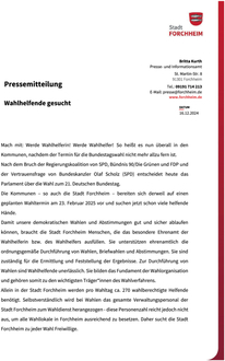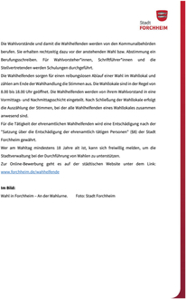 (Stadt Forchheim). Mach mit: Werde Wahlhelferin! Werde Wahlhelfer! So heißt es nun überall in den Kommunen, nachdem der Termin für die Bundestagswahl nicht mehr allzu fern ist. Nach dem Bruch der Regierungskoalition von SPD, Bündnis 90/Die Grünen und FDP und der Vertrauensfrage von Bundeskanzler Olaf Scholz (SPD) entscheidet heute das Parlament über die Wahl zum 21. Deutschen Bundestag. Die Kommunen - so auch die Stadt Forchheim - bereiten sich derweil auf einen geplanten Wahltermin am 23. Februar 2025 vor und suchen jetzt schon viele helfende Hände. Damit unsere demokratischen Wahlen und Abstimmungen gut und sicher ablaufen können, braucht die Stadt Forchheim Menschen, die das besondere Ehrenamt der Wahlhelferin bzw. des Wahlhelfers ausfüllen. Sie unterstützen ehrenamtlich die ordnungsgemäße Durchführung von Wahlen, Briefwahlen und Abstimmungen. Sie sind zuständig für die Ermittlung und Feststellung der Ergebnisse. Zur Durchführung von Wahlen sind Wahlhelfende unerlässlich. Sie bilden das Fundament der Wahlorganisation und gehören somit zu den wichtigsten Träger*innen des Wahlverfahrens. Allein in der Stadt Forchheim werden pro Wahltag ca. 270 wahlberechtigte Helfende benötigt. Selbstverständlich wird bei Wahlen das gesamte Verwaltungspersonal der Stadt Forchheim zum Wahldienst herangezogen - diese Personenzahl reicht jedoch nicht aus, um alle Wahllokale in Forchheim ausreichend zu besetzen. Daher sucht die Stadt Forchheim zu jeder Wahl Freiwillige. Die Wahlvorstände und damit die Wahlhelfenden werden von den Kommunalbehörden berufen. Sie erhalten rechtzeitig dazu vor der anstehenden Wahl bzw. Abstimmung ein Berufungsschreiben. Für Wahlvorsteher*innen, Schriftführer*innen und die Stellvertretenden werden Schulungen durchgeführt. Die Wahlhelfenden sorgen für einen reibungslosen Ablauf einer Wahl im Wahllokal und zählen am Ende der Wahlhandlung die Stimmen aus. Die Wahllokale sind in der Regel von 8.00 bis 18.00 Uhr geöffnet. Die Wahlhelfenden werden von ihrem Wahlvorstand in eine Vormittags- und Nachmittagsschicht eingeteilt. Nach Schließung der Wahllokale erfolgt die Auszählung der Stimmen, bei der alle Wahlhelfenden eines Wahllokales zusammen anwesend sind. Für die Tätigkeit der ehrenamtlichen Wahlhelfenden wird eine Entschädigung nach der "Satzung über die Entschädigung der ehrenamtlich tätigen Personen" (§8) der Stadt Forchheim gewährt. Wer am Wahltag mindestens 18 Jahre alt ist, kann sich freiwillig melden, um die Stadtverwaltung bei der Durchführung von Wahlen zu unterstützen. Zur Online-Bewerbung geht es auf der städtischen Website unter dem Link: www.forchheim.de/wahhelfende.